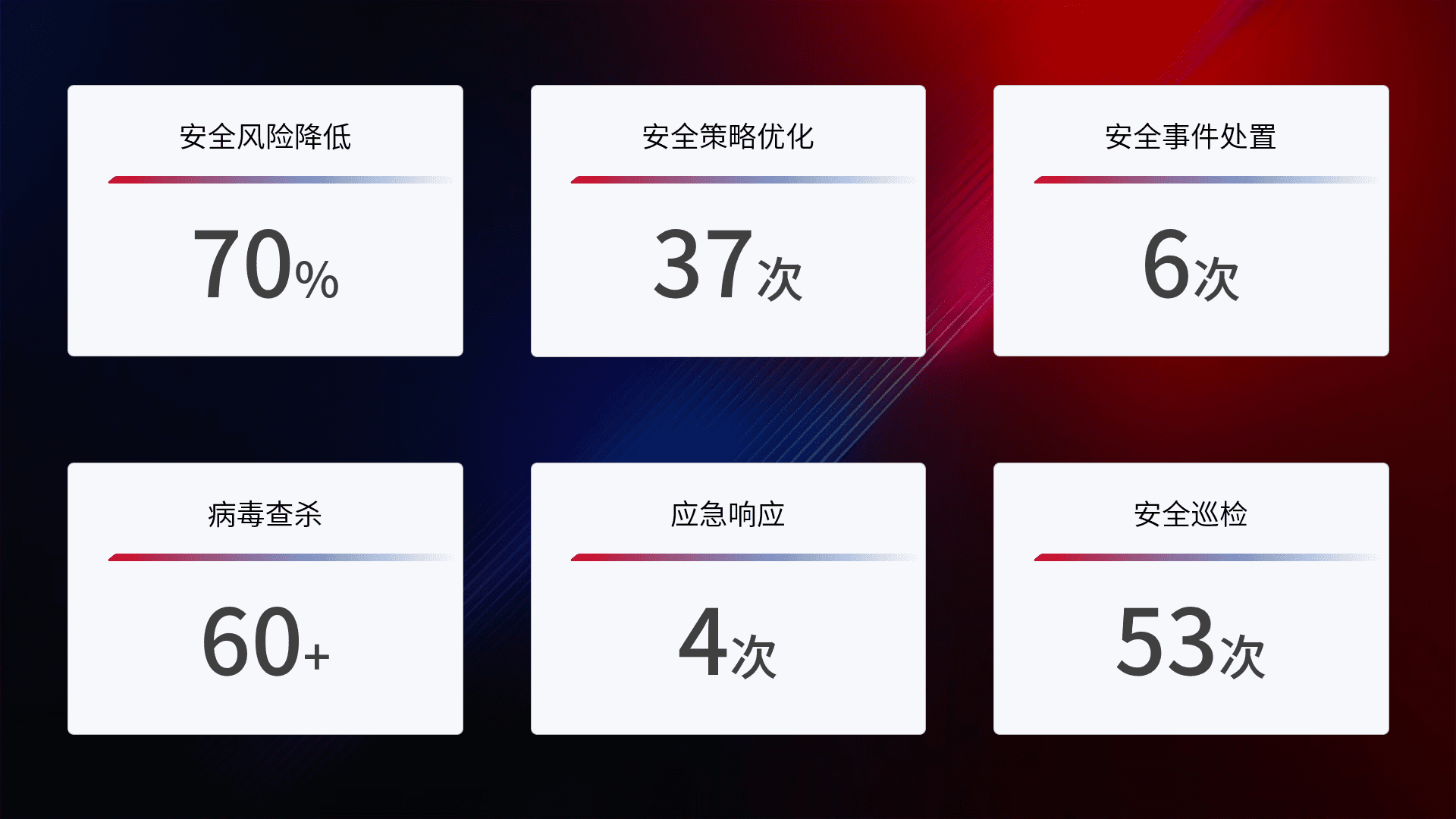 提供全面的安全事件报告体系,,,,包括处置报告、、、周报、、、季度和年度总结,,,,结合持续监控,,帮助客户深入了解网络安全状况。。。。